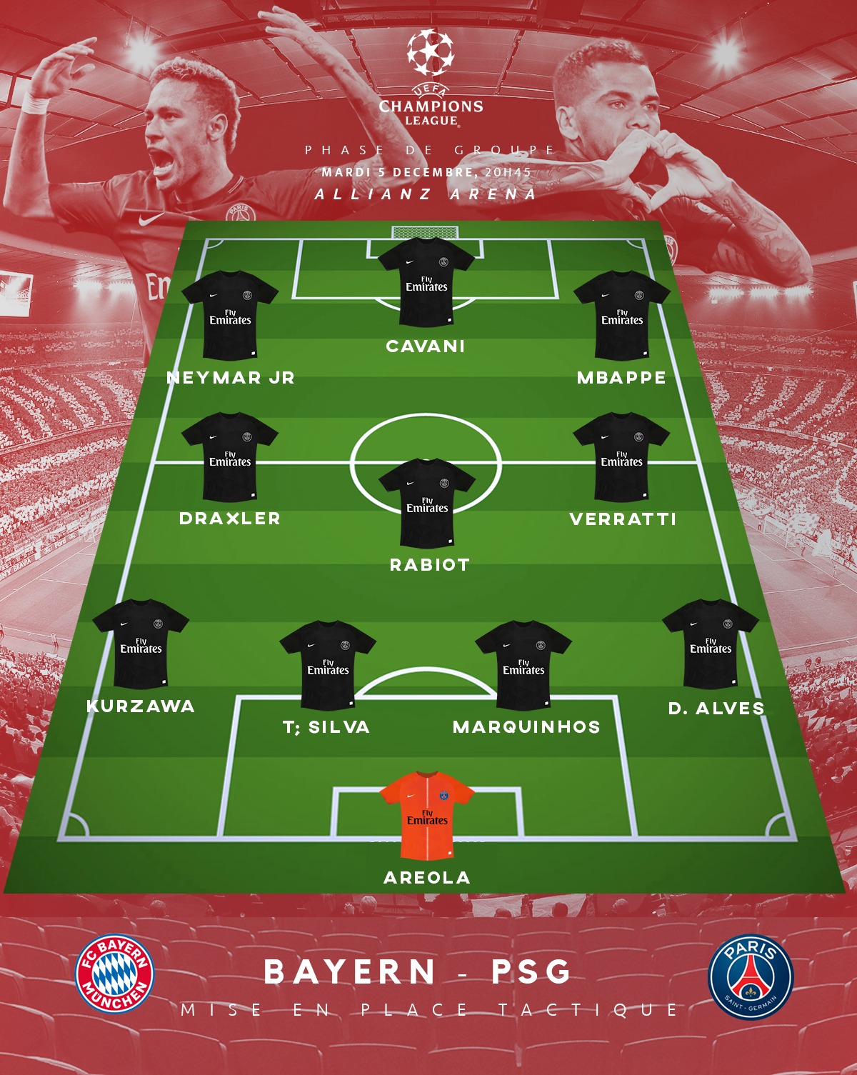 Apres son match frustrant à Strasbourg, Areola tentera de repartir du bon pied en tentant de garder ses cages inviolées es. La charnière centrale était, elle, composée de Marquinhos et du capitaine Thiago Silva. Sur les côtés, Kurzawa et l’inamovible Dani Alves ont complété la ligne de quatre défenseurs. En l’absence de Motta, on retrouvait donc le trio Rabiot-Verratti-Draxler au milieu. Devant cette ligne, la MCN, Neymar et Mbappé, qui ont énormément dezonné, se sont chargés d’alimenter l’actuel meilleur buteur européen Edinson Cavani. Pour le Paris Saint-Germain, l’enjeu est réel : conserver la première place du groupe, qui pourrait assurer un meilleur adversaire lors du tirage au sort des 8es de finale de LDC, lundi prochain à Nyon.